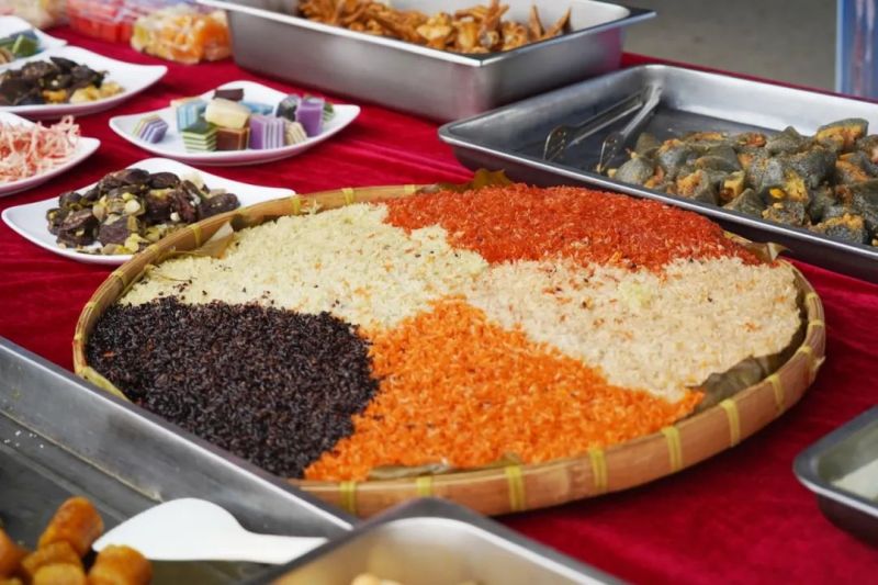 伴隨著此起彼伏、高遏行云的歌聲,另一邊的長桌美食盛宴也拉開帷幕,有象征吉祥如意、五谷豐登的五色糯米飯;有清香四溢、滿口香甜的各色水果;有清甜軟糯、蘊含著壯族人民對美好生活向往的粽子;還有各式各樣、滿口留香的面點......食材豐富,色香味俱佳,把壯鄉民俗特色展現得淋漓盡致。