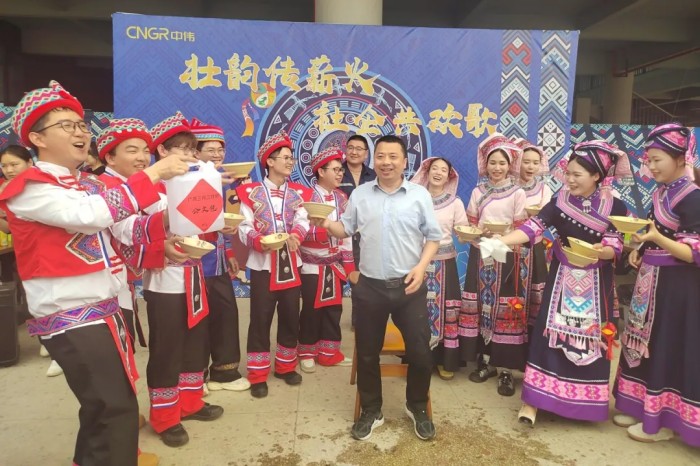 隨著一陣清脆的竹笛聲響起,基地員工、社區居民和學校師生們身著靚麗民族服飾隆重登場,化身“劉三姐”和“阿牛哥”進行山歌對唱。大家以歌言志、以歌會友、以歌傳情,唱響社企共建的優美旋律,讓動聽山歌在新時代的舞臺上煥發出全新光彩。
