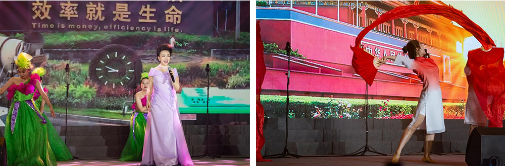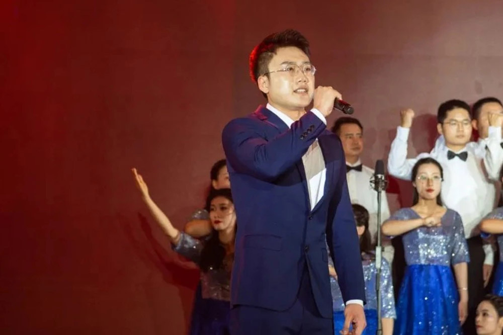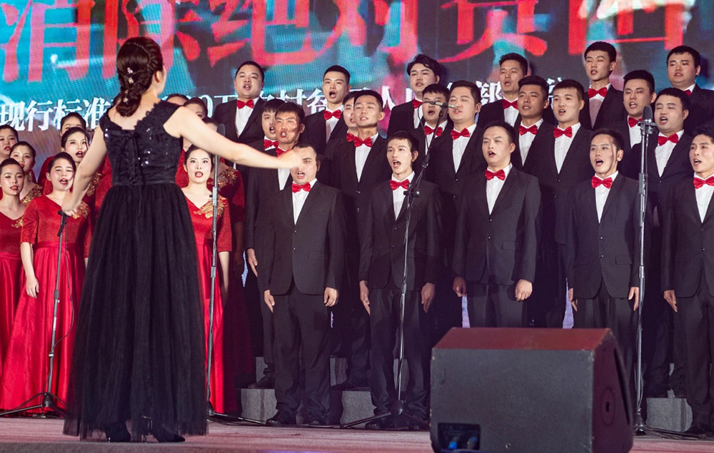 在主持人的宣布下,合唱比賽正式開始。來自各事業部、各產業基地的8支隊伍相繼登臺,他們或穿著光彩照人、顏色各異的演出服,或穿著整齊莊嚴、意義非凡的紅軍服,伴隨著音樂老師的指揮,用嘹亮、深情的歌聲,回顧和紀念中國共產黨的百年奮斗史。