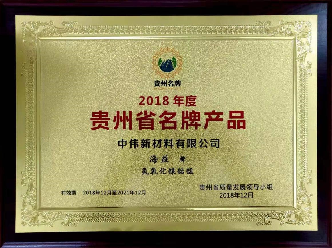 9月5日,在貴州銅仁市,當地質量發展領導小組對榮獲2018年度“貴州省名牌產品”稱號企業進行授牌。頒獎儀式上,中偉新材料憑借海益牌氫氧化鎳鈷錳產品獲此殊榮,這是對企業產品的高度肯定。